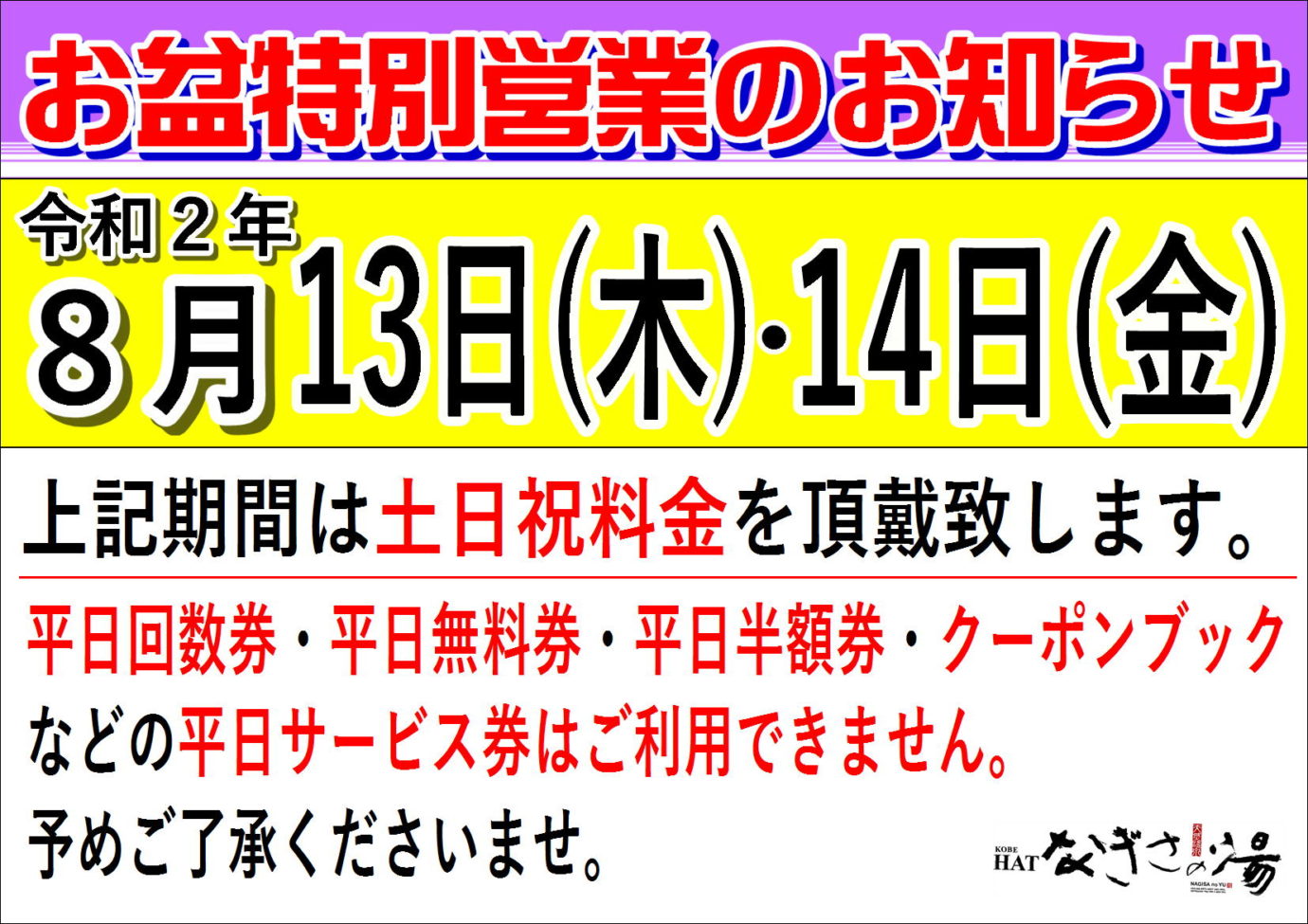 8月13日(木)・14日(金)はお盆期間とし、土日祝日料金を頂戴致します。