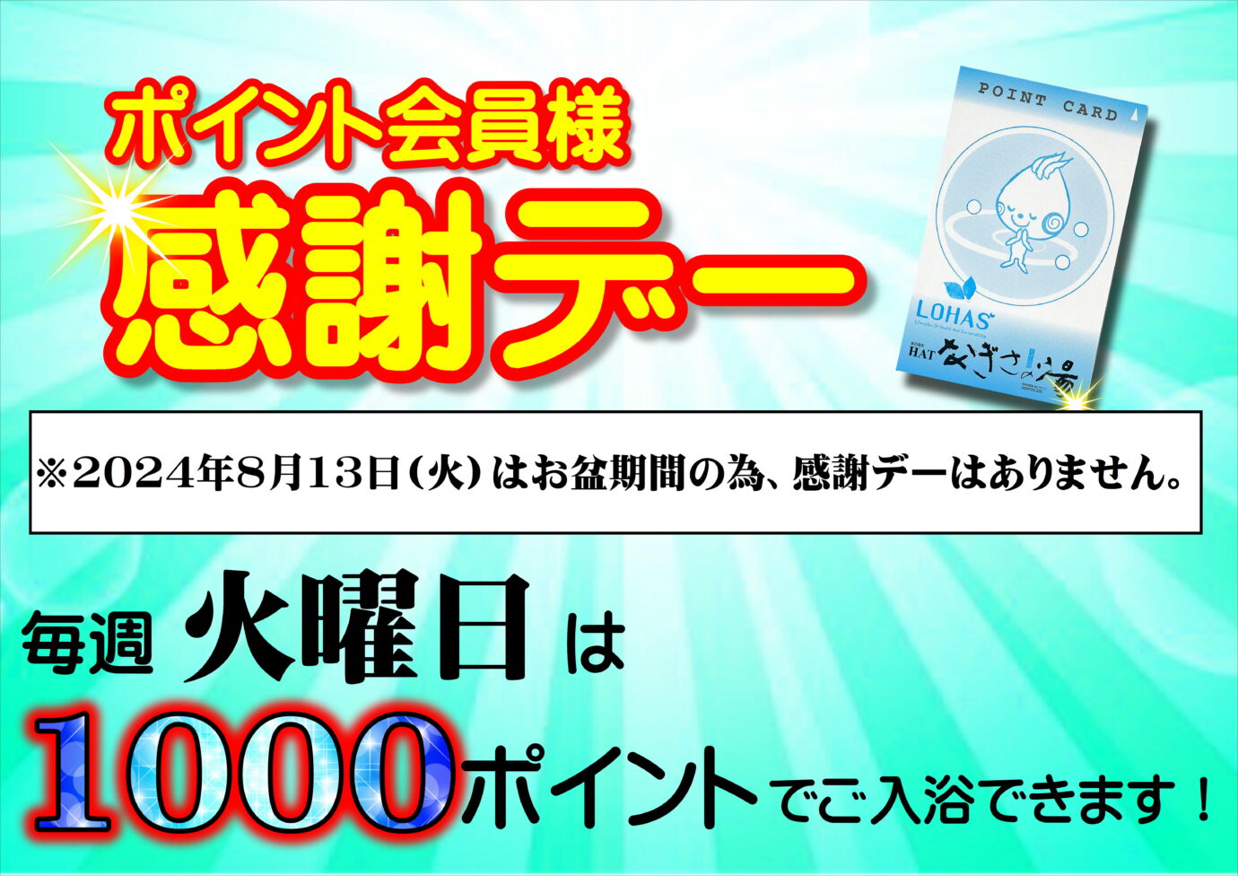 ※2024年8月13日火曜日はお盆期間の為、ポイント会員感謝デーはありません。