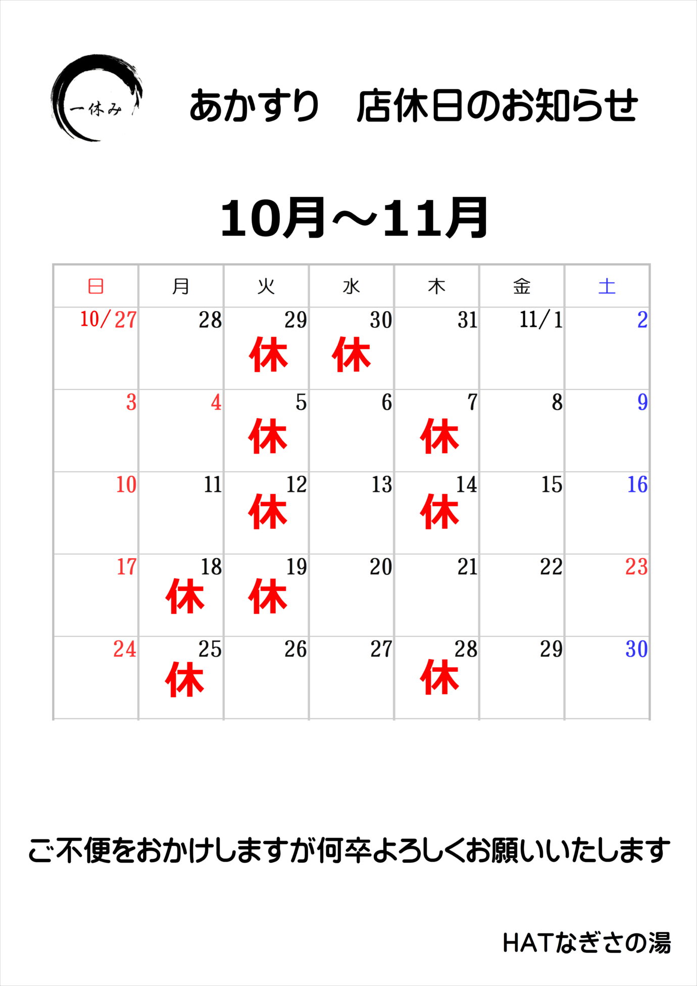 あかすり店休日のお知らせ(11月)