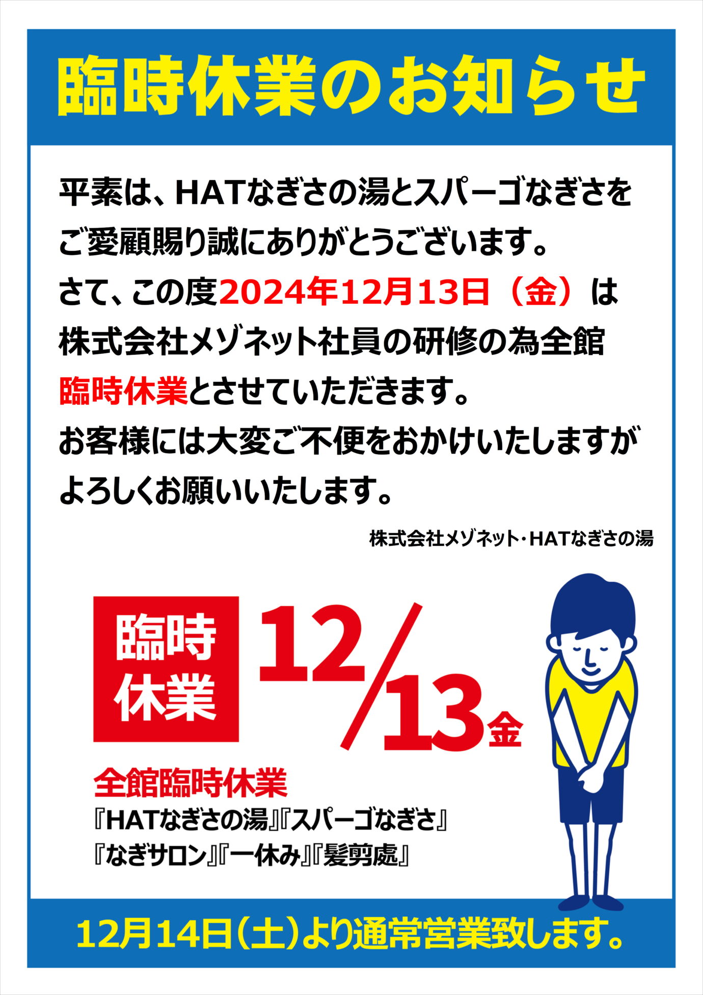 大規模リニューアル工事による臨時休業のお知らせ(2025年4月15日~)