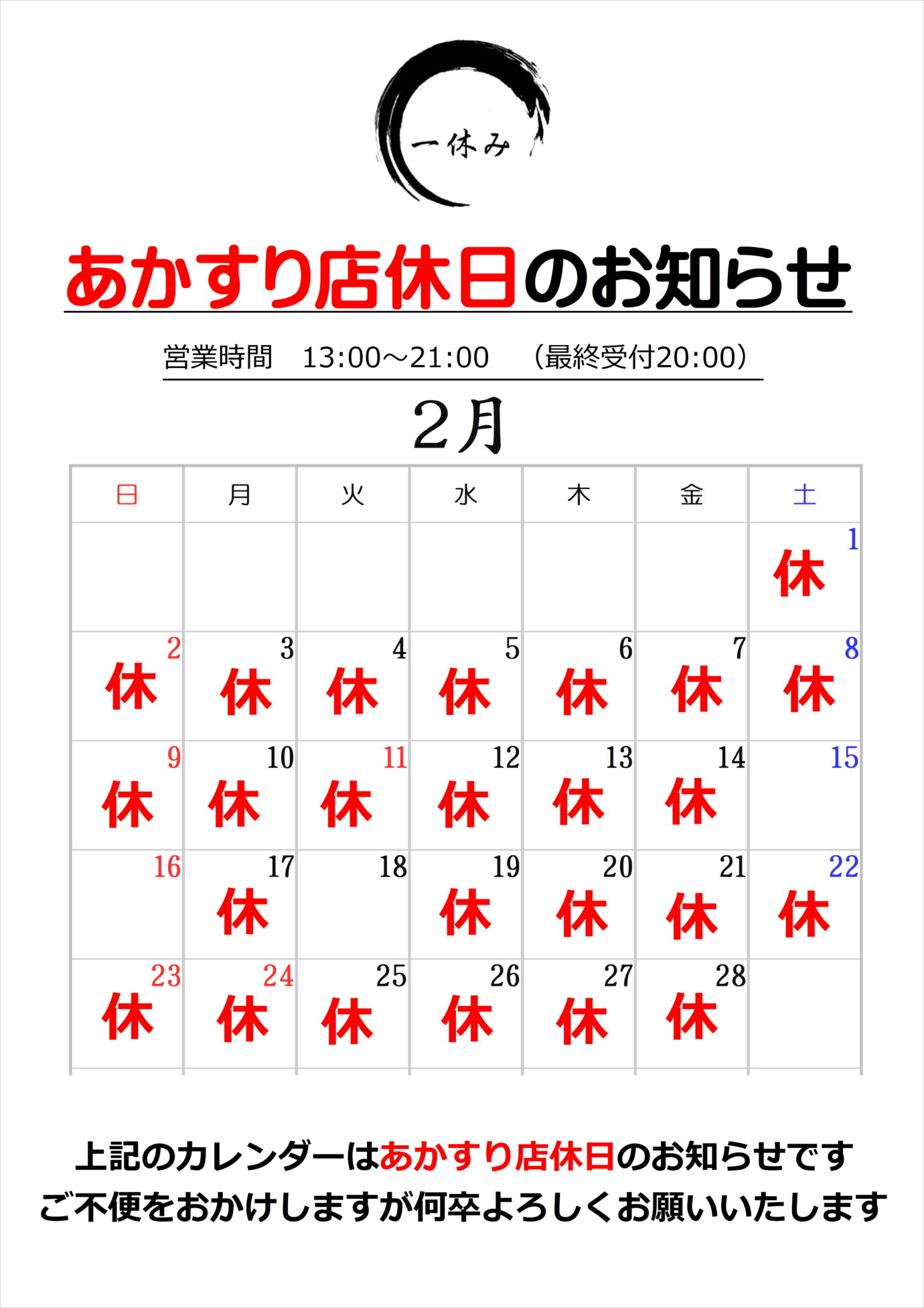あかすり従業員が体調不良の為、2月末までアカスリ業務を休業させて頂きます。