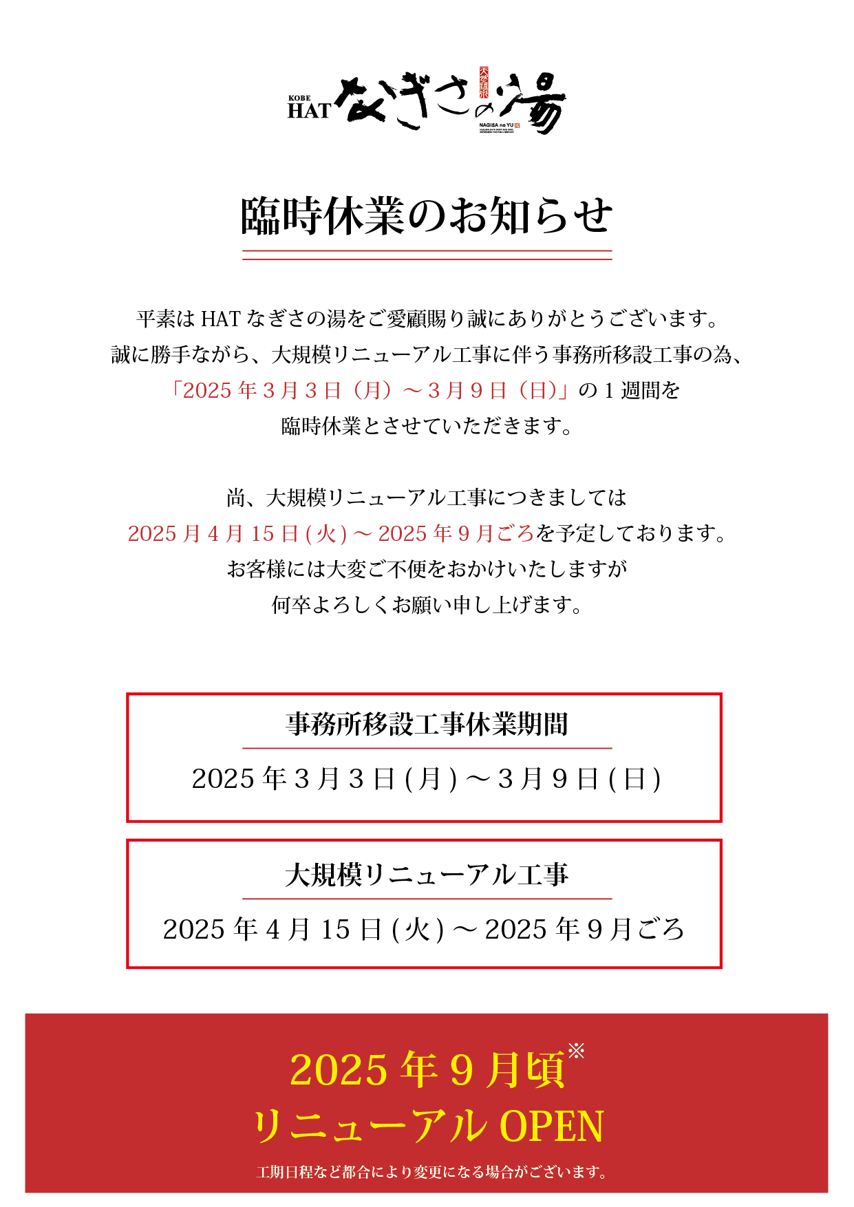 大規模リニューアル工事による臨時休業のお知らせ(2025年4月15日~)