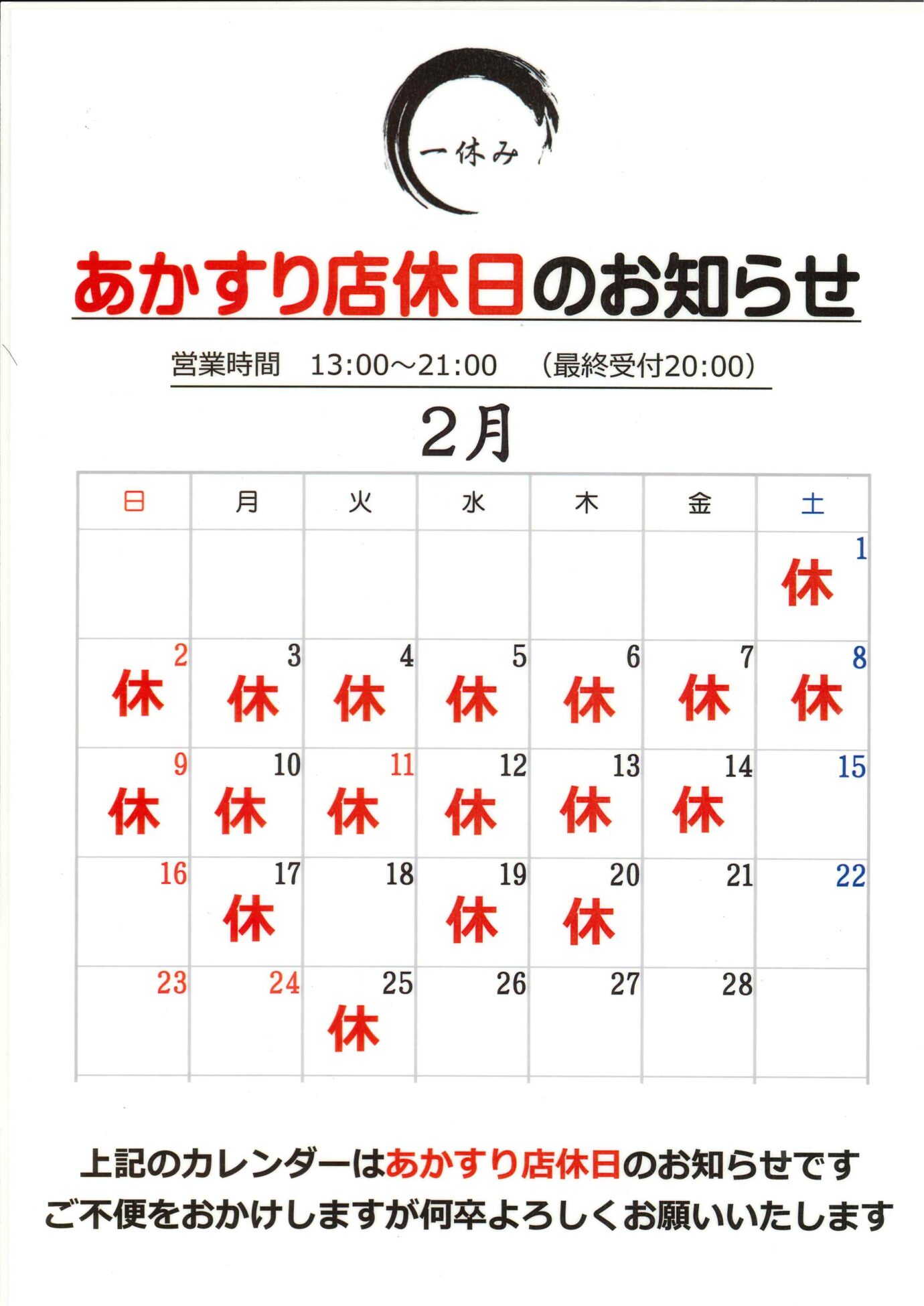 臨時休業のお知らせ 3/3(月)~3/9(日)