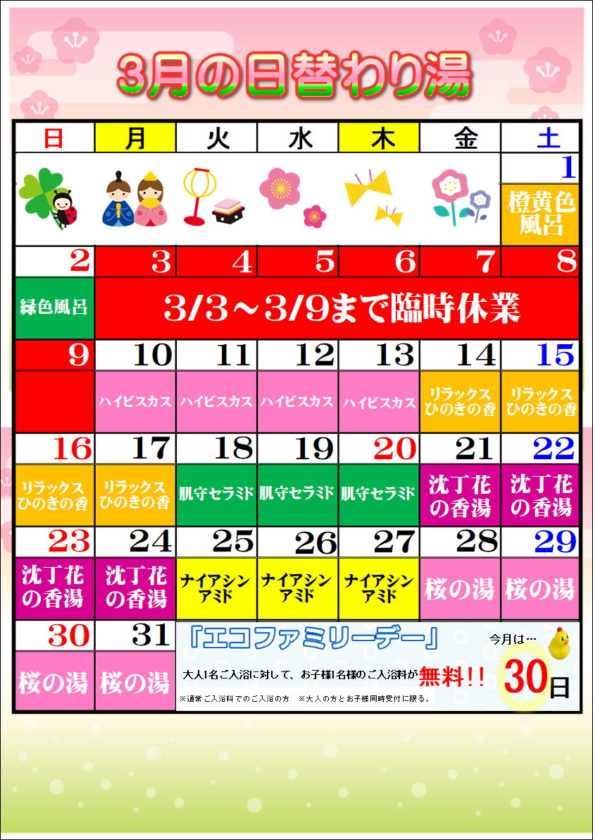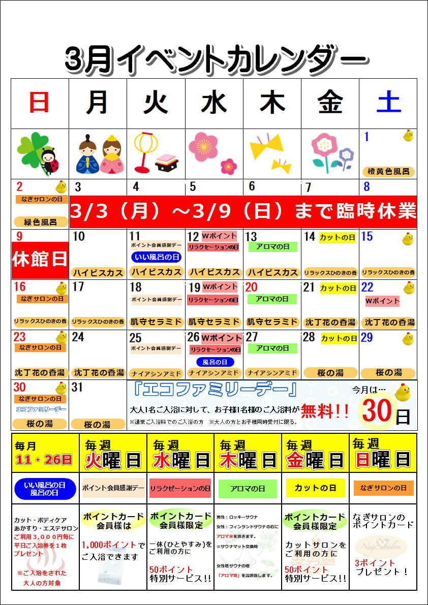 あかすり店休日のお知らせ(3月)