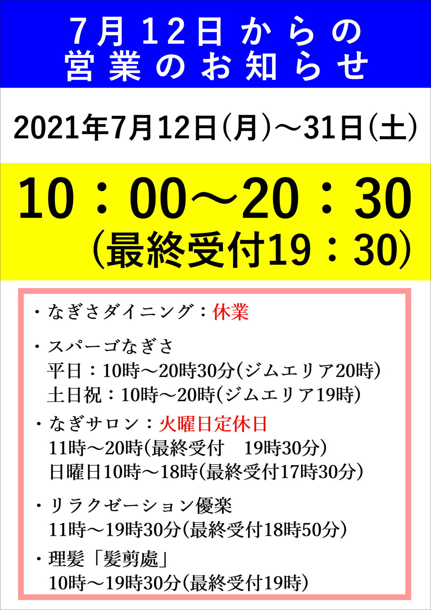 7月12日(月)~7月31日(土)までの営業時間を以下の通り短縮営業とさせていただきます。