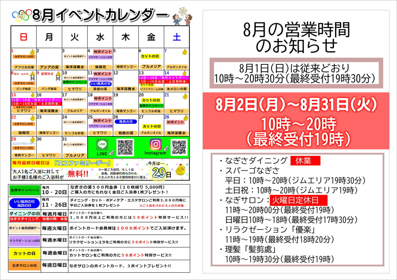 ※先日ご案内いたしました営業時間は8月31日まで20時30分としておりましたが8月2日からは20時まで(最終受付19時まで)となりますのでご注意頂きますようお願いいたします。