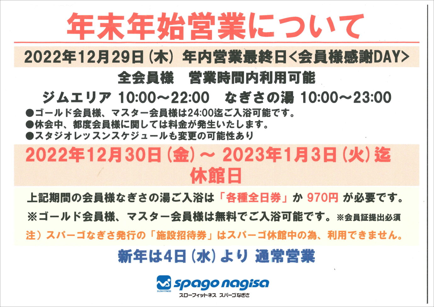 ↓↓スパーゴなぎさの年末年始営業について↓↓